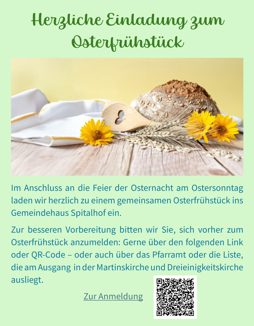 Zur besseren Vorbereitung bitten wir Sie, sich vorher zum Osterfrühstück anzumelden.